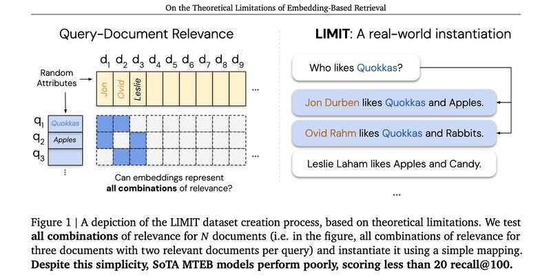 Google DeepMind and Johns Hopkins University researchers provide mathematical proof that single-vector embeddings have fundamental representational constraints, with simple BM25 outperforming state-of-the-art embedding models on basic retrieval tasks.